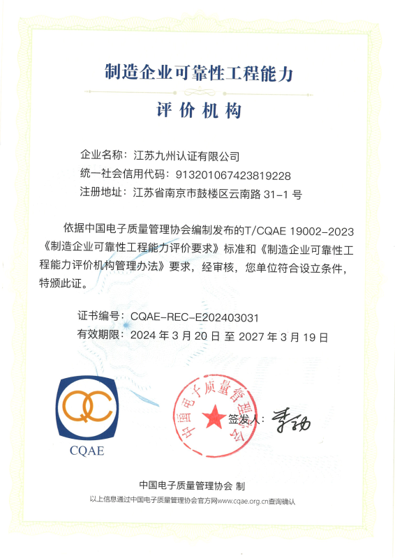 制造企业可靠性工程能力评价机构证书