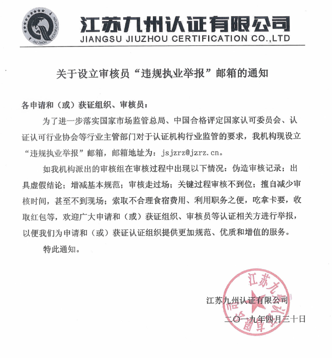 江苏九州认证有限公司关于新版《质量管理体系认证规则》的客户告知函