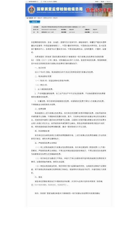 质检总局关于贯彻落实取消或停征4项行政事业性收费决定的通知(国质检财函〔2017〕140号)